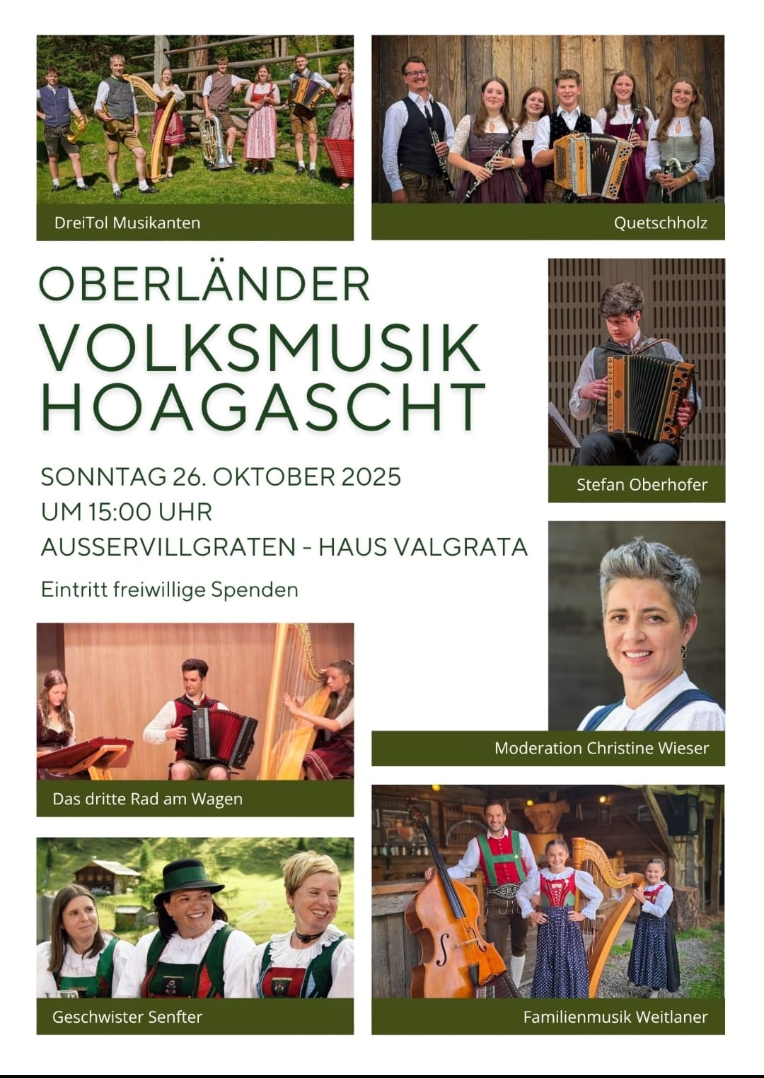 | 26.10.2025 | Oberländer Volksmusik Hoagascht | Obertilliach | Osttirol | |